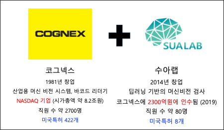 2019년 10월에는 머신 비전 분야의 선두주자인 코그넥스가 한국의 딥러닝 기반 머신비전 기술기업 수아랩을 1억 9500만 달러(약 2300억원)에 인수했다. 창업한지 40년이 넘은 ‘바코드 리더기’ 만드는 NASDAQ 상장사가 왜 창업한지 5년 밖에 되지 않은 딥러닝 기반의 머신비전 검사 소프트웨어 회사를 인수하는데 2300억원이라는 거금을 썼을까?